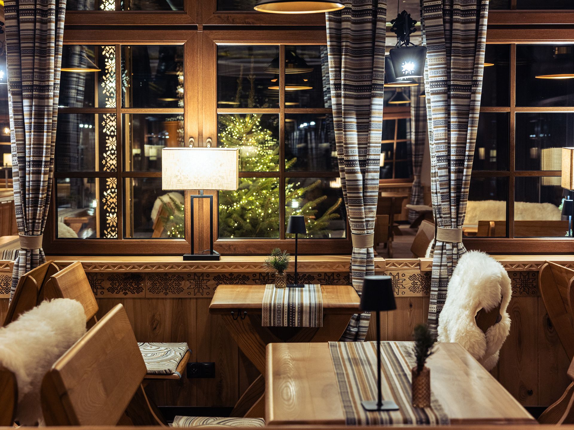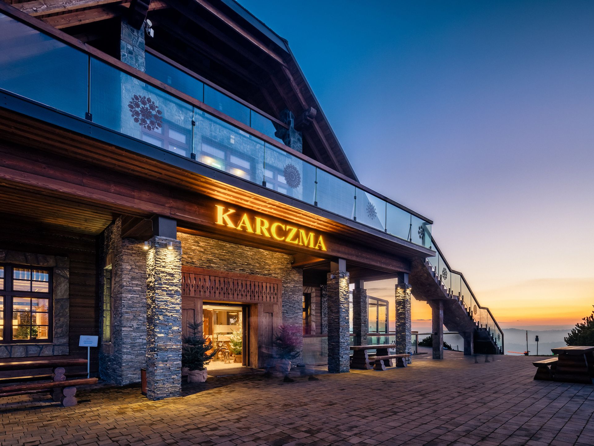Drewniana karczma na szczycie góry to nie tylko miejsce – to przeżycie. Przytulne wnętrze z kominkiem, drewnianymi belkami i góralskimi detalami tworzy atmosferę, w której każdy czuje się dobrze. Z sali rozciąga się widok na beskidzką panoramę – idealne tło do rodzinnych obiadów, kolacji przy winie czy długich rozmów przy stole.