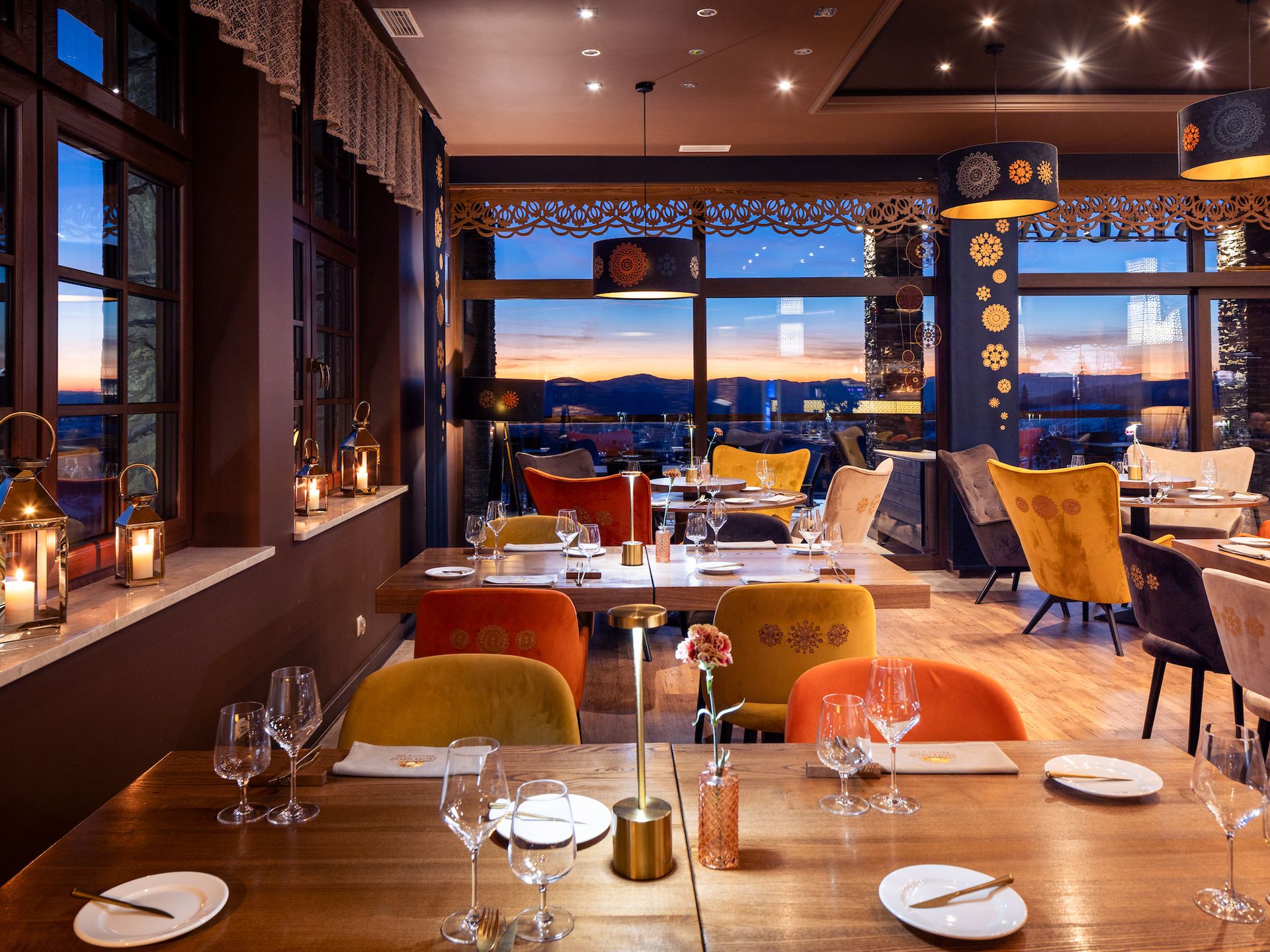 Wnętrza restauracji otwierają się na panoramę Beskidów, gdzie światło gór staje się naturalnym tłem kulinarnego doświadczenia. Elegancka, stonowana przestrzeń, wzbogacona detalami inspirowanymi góralskim rzemiosłem, łączy nowoczesny komfort z autentycznym charakterem miejsca.